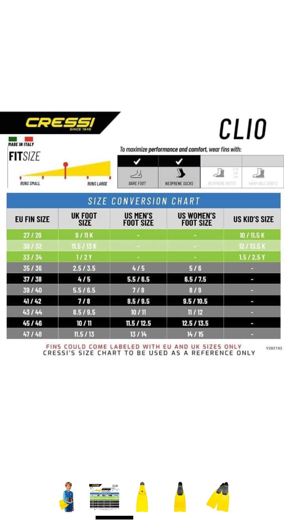تتميز زعانف سباحة كريسي كليو Cressi Clio Fins الإيطالية بجودة تصنيع عالية. كما أنها توفر أداء ممتاز داخل الماء. لذلك فهي مناسبة للسباحة والغطس والتدريبات المائية المختلفة.